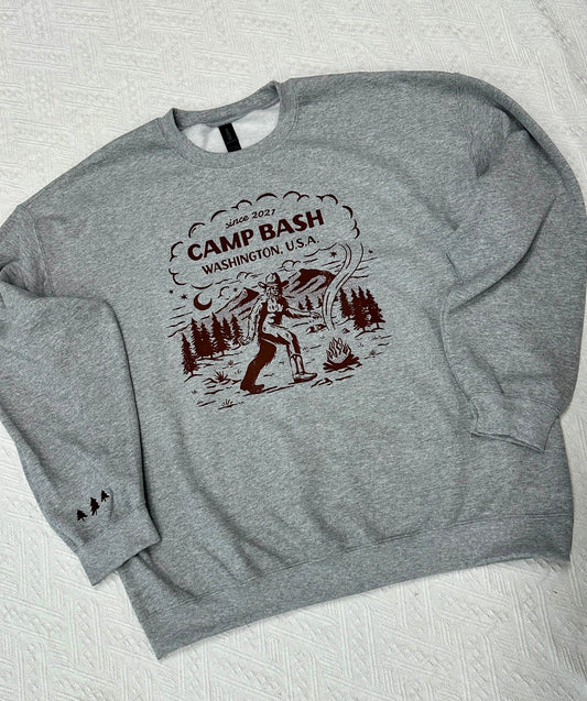 Camp BASH Bigfoot Gildan Crewneck Sweatshirt – PNW Sasquatch Camping Graphic