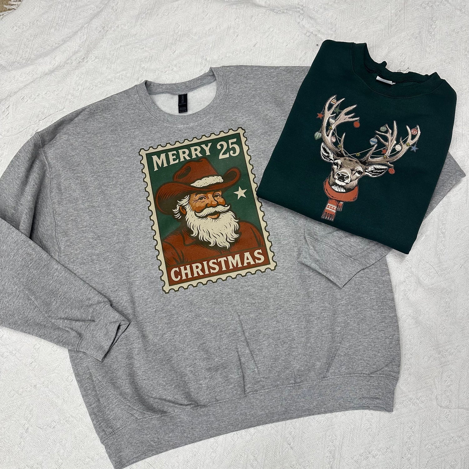 Vintage Santa Post Stamp Crewneck | Rustic Cowboy Santa Christmas Stamp Crew