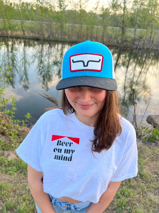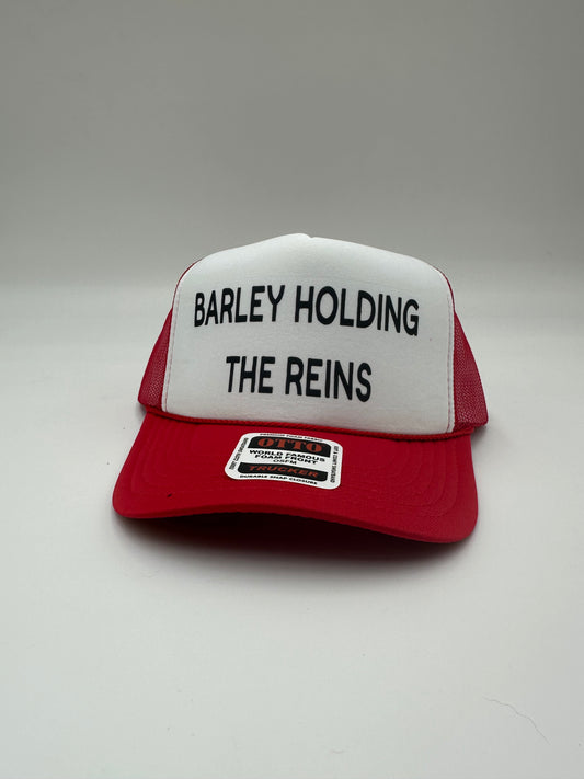 Barley Holding the Reins Trucker Hat – Funny Western Graphic Cap, Red and White Snapback