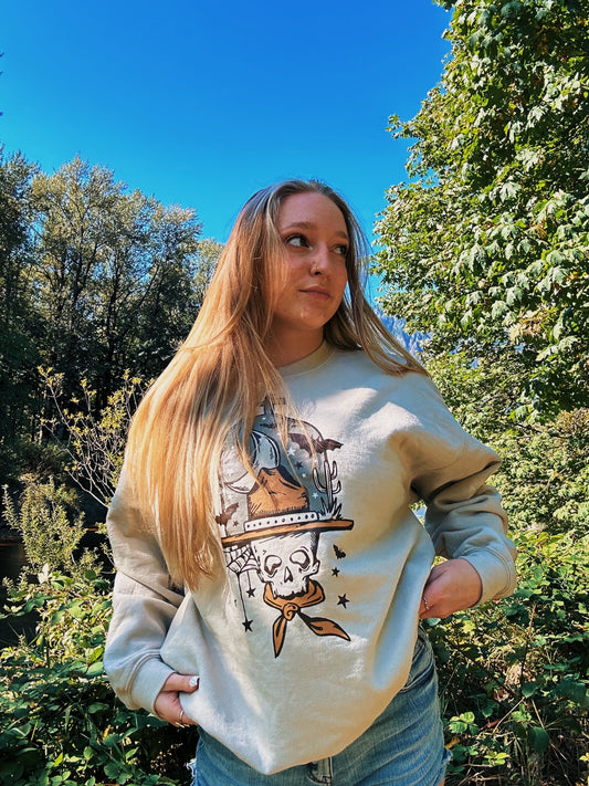 Cowboy Skeleton Western Crewneck – Hand Drawn Graphic on Gildan Fleece