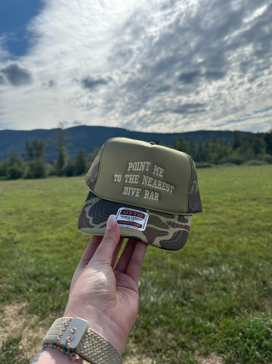 Point Me to the Nearest Dive Bar Embroidered Trucker Hat – Camo Otto Cap