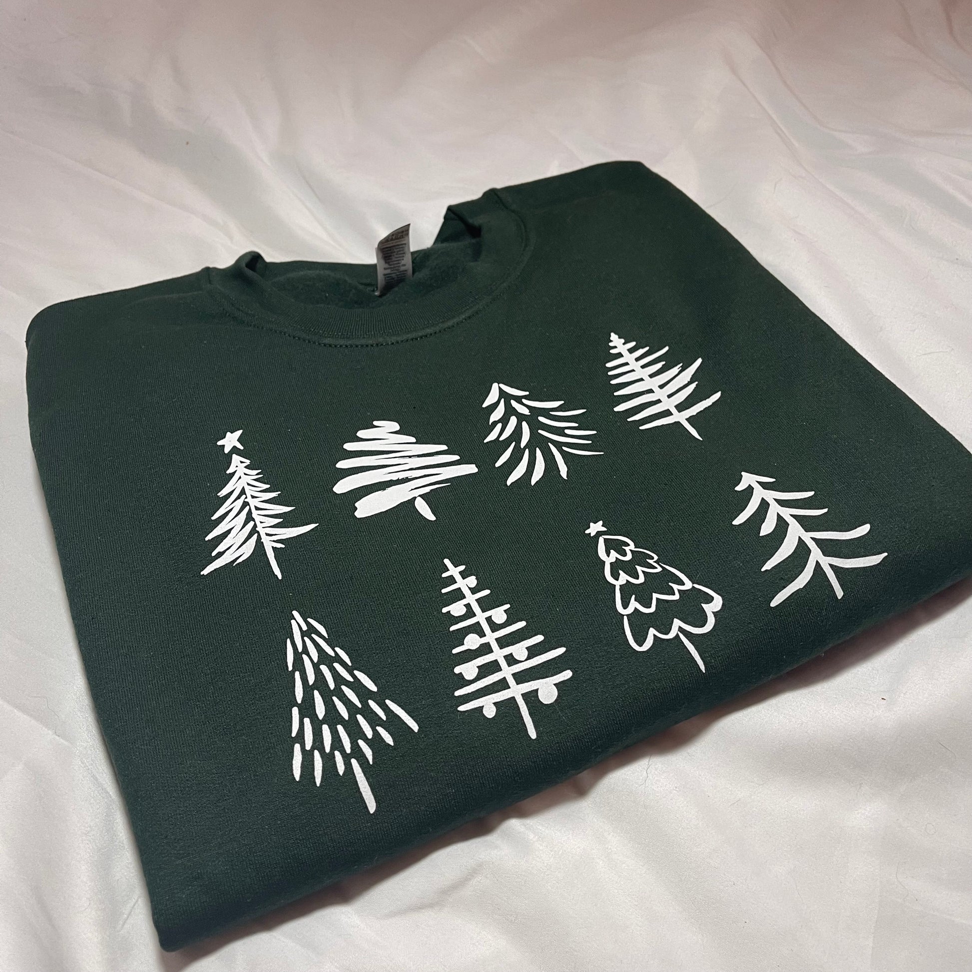 Keywords for SEO: Christmas crewneck, holiday sweatshirt, Gildan crewneck, forest green sweater, hand drawn Christmas tree shirt, cozy Christmas sweatshirt, minimalist holiday apparel, winter aesthetic