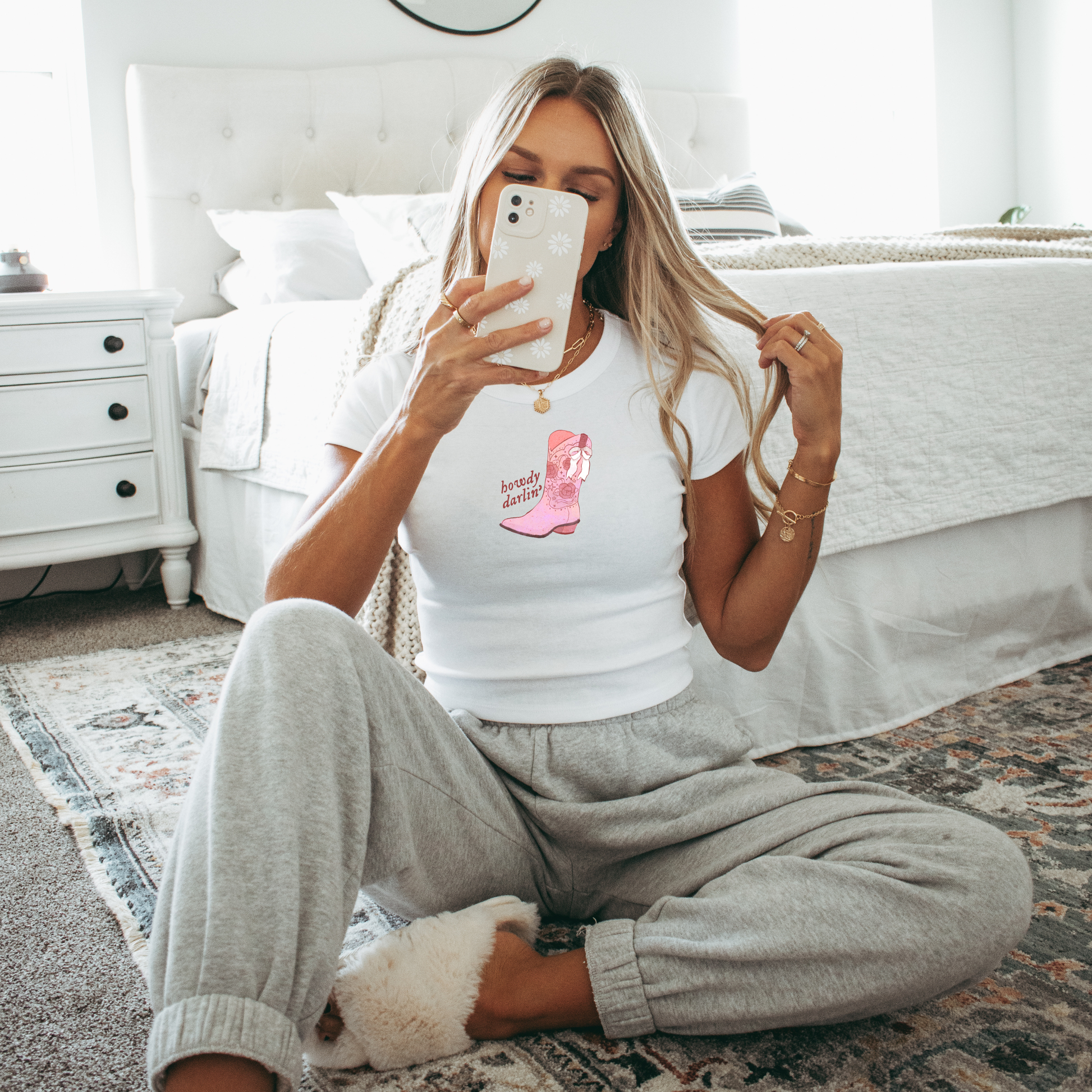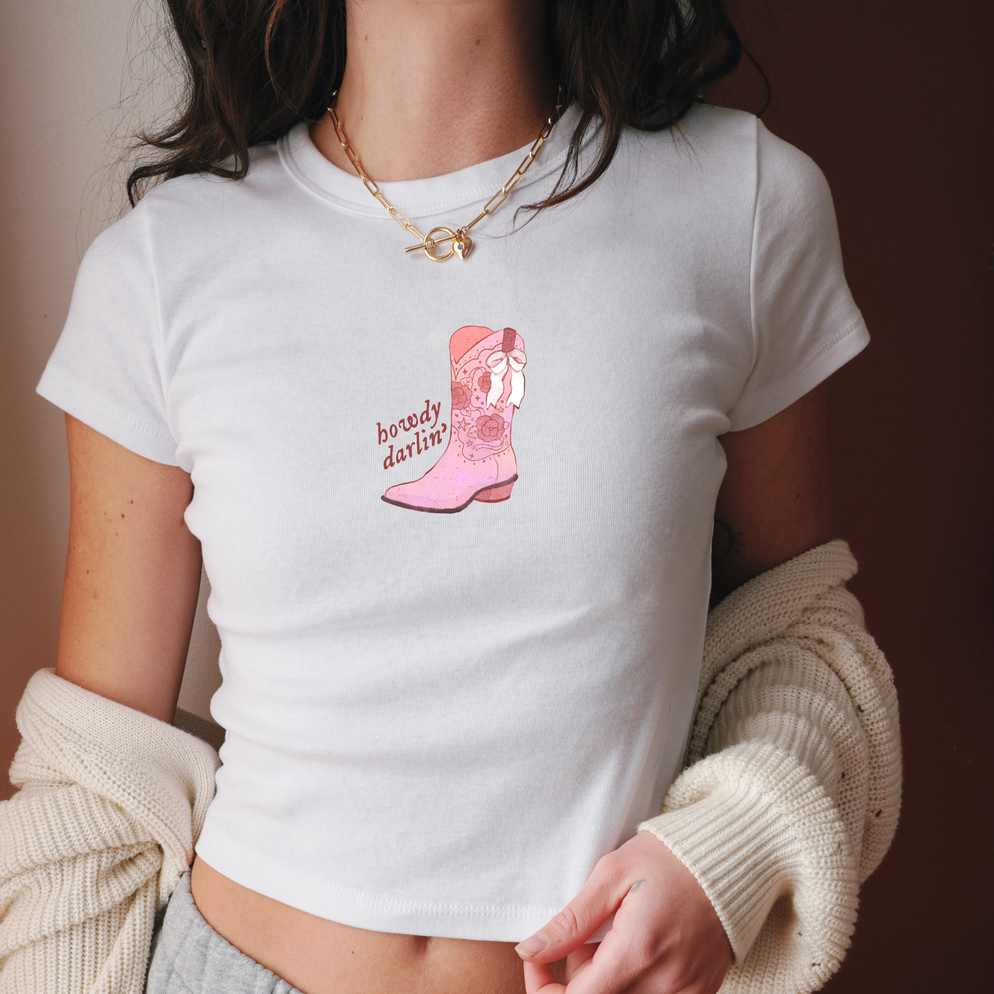 Adorable crop Bella + Canvas tee with a hand-drawn boot design by @stacypotato_