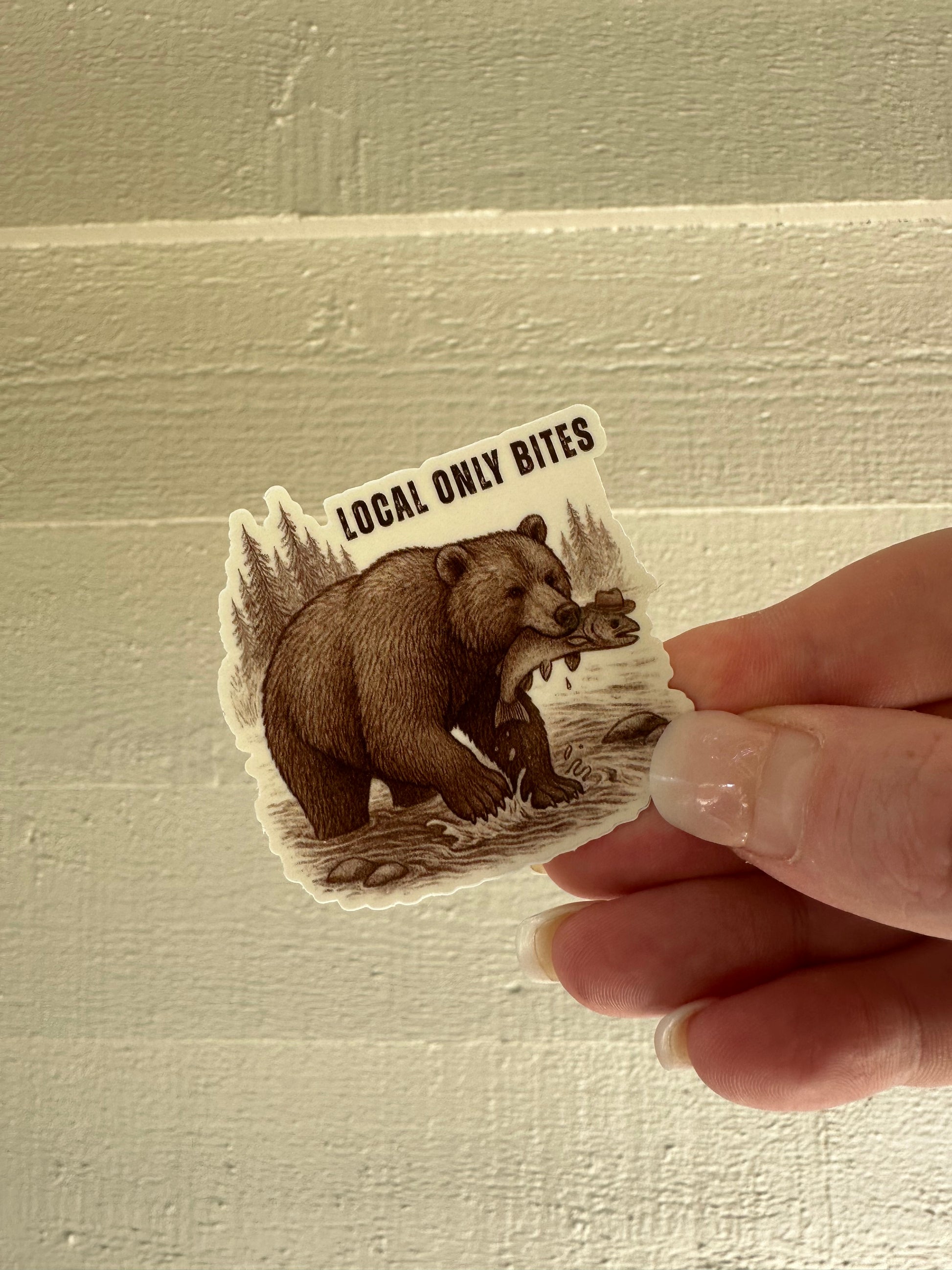 Bring a bite of the wild to your gear with the Local Only Bites sticker. Featuring a detailed illustration of a bear catching its dinner, this outdoors-inspired design is perfect for anyone who loves a little wilderness attitude.
