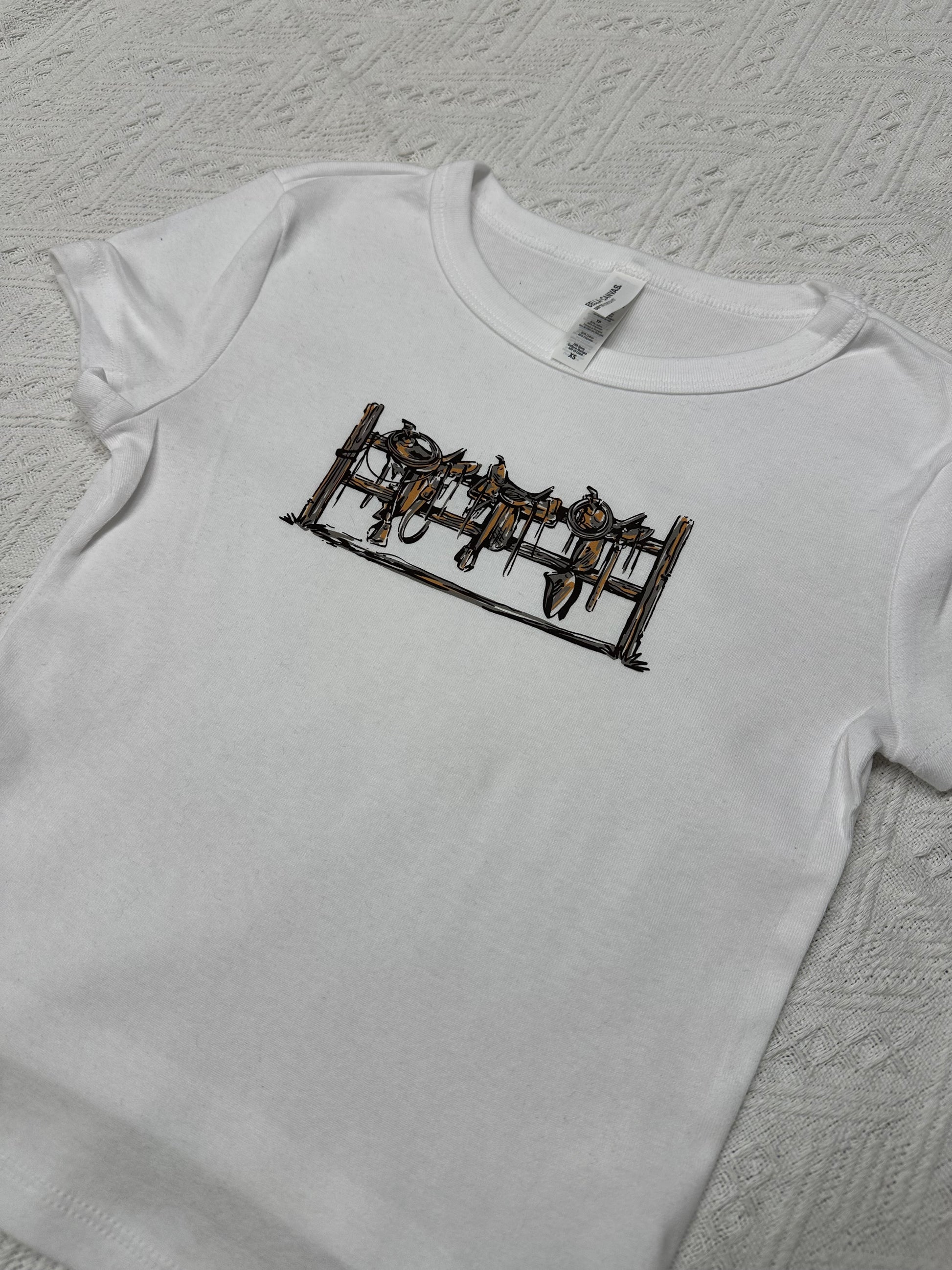 The Saddles Up Cropped Tee features the same ranch-inspired artwork designed in collaboration with @cmfgraphics, showing a lineup of saddles, hats, and tack hanging along a classic split rail fence. It’s a simple scene that every horse girl and ranch lover recognizes instantly.